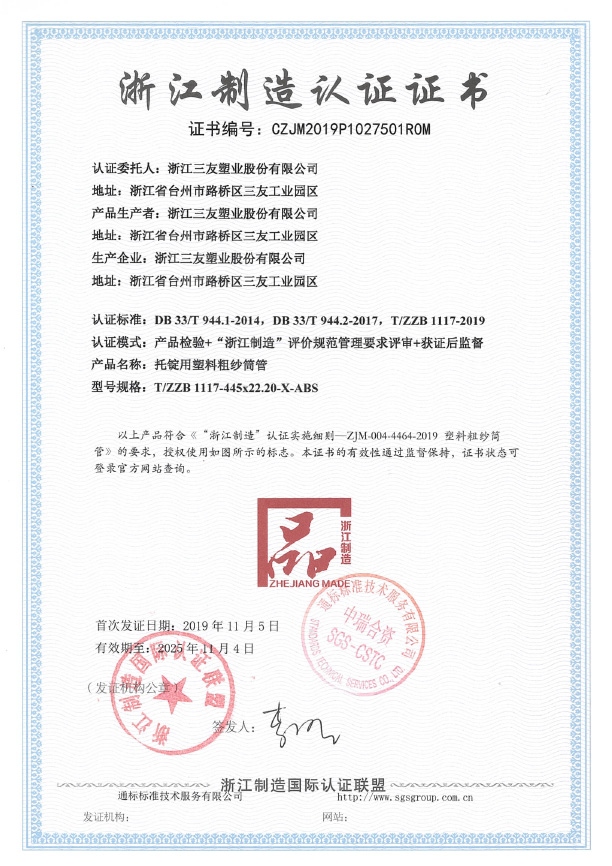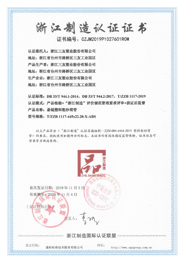 浙江三友塑業(yè)股份有限公司是國內(nèi)知名的紡織器材(塑料紗管)專業(yè)制造企業(yè),系國家紡織器材(塑料紗管)行業(yè)標準主要起草制定單位之一,生產(chǎn)的塑料紗管系列產(chǎn)品占行業(yè)總量的30%以上,國內(nèi)前100家大型棉紡企業(yè)是公司的戰(zhàn)略合作單位,產(chǎn)品連續(xù)十多年經(jīng)國家紡織器材測試中心檢測,達到優(yōu)等品水平。今年6月,公司起草制定的浙江制造團體標準《塑料粗紗筒管》正式發(fā)布,之后公司按照“浙江制造”評價規(guī)范進行管理提升。今年10月,第三方認證機構(gòu)對公司管理體系、基礎(chǔ)設(shè)施、自主創(chuàng)新等多個方面進行嚴格認證通過現(xiàn)場審核,并與近日獲得“品字標浙江制造”認證證書。