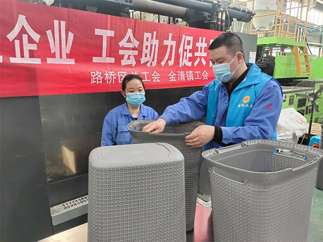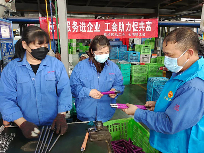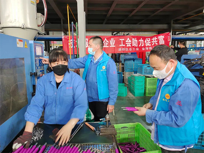 4月19日,在三友控股集團有限公司車間里, 臺州市勞模、集團公司日用品事業(yè)部包裝主管陳輝、路橋工匠、模具車間主任秦春華、路橋工匠、成型車間主任梁月檀、路橋工匠、加工車間主任梁道聰?shù)冉M成勞模工匠技術服務隊在三友控股集團有限公司生產(chǎn)車間為公司新進一線職工提供技術指導服務,幫助他們針對性地解決技術難題。